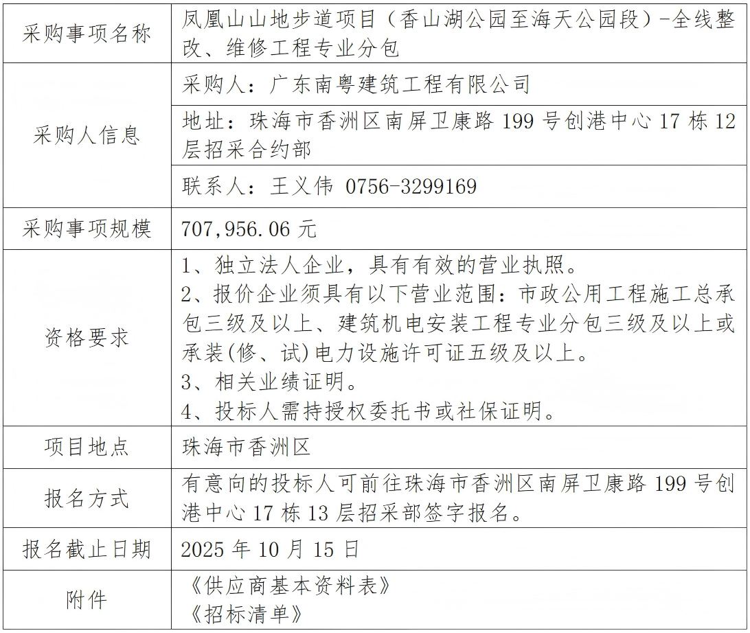 鳳凰山山地步道項目(香山湖公園至海天公園段)-全線整改、維修工程專業(yè)分包 專欄:工程招標(biāo) 發(fā)布日期: 2025-10-13 作者:招采管理中心 附件:供應(yīng)商基本資料表 附件:鳳凰山山地步道項目(香山湖公園至海天公園段)-全線整改、維修工程招標(biāo)清單 返回列表 上一篇:廣昌保障房配套基礎(chǔ)設(shè)施項目施工總承包--臨建零星工程勞務(wù)分包(原臨建專業(yè)分包變更) 下一篇:G105國道綜合提升工程設(shè)計施工總承包項目-輔道污水外溢及電力排管工程專業(yè)分包