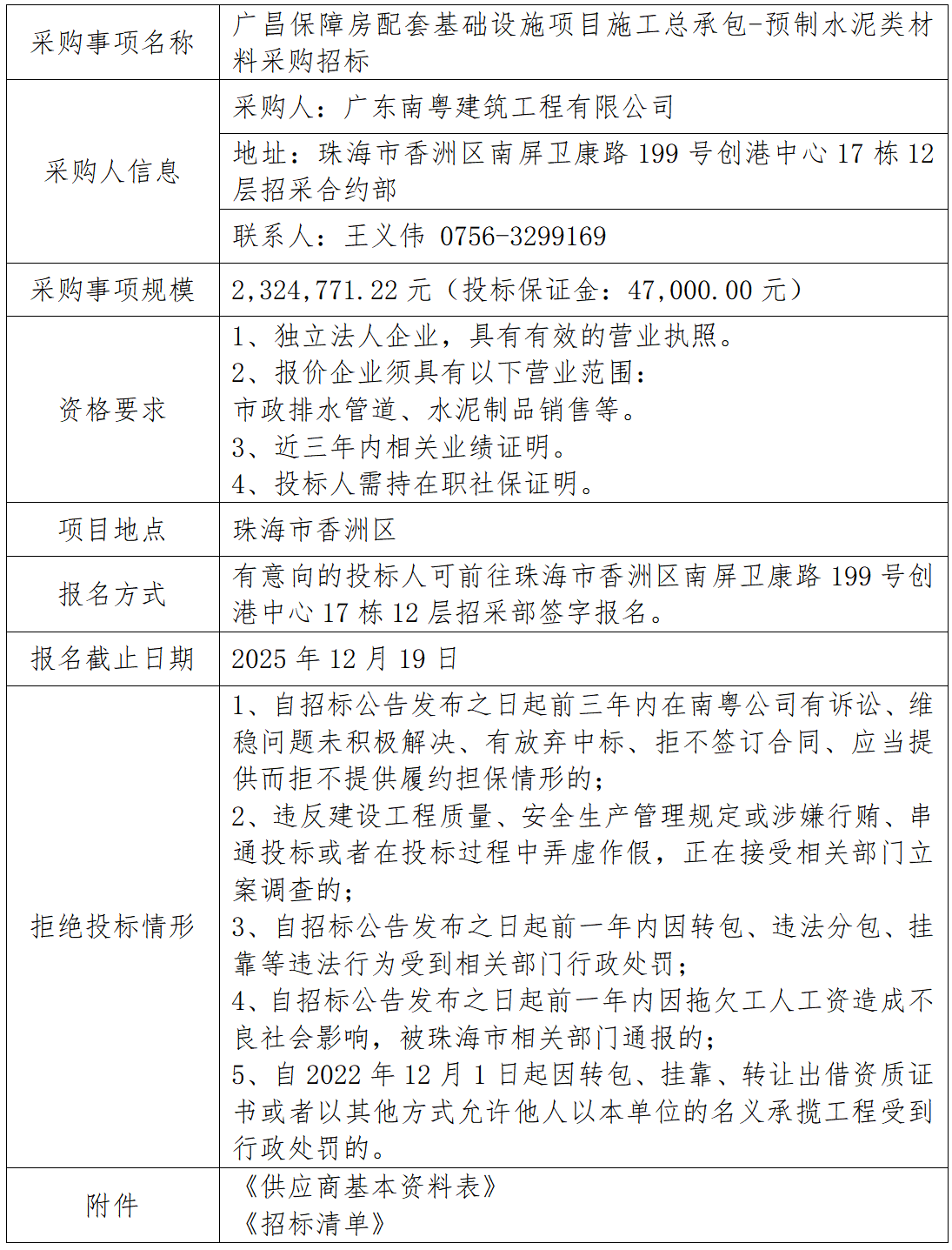 廣昌保障房配套基礎(chǔ)設(shè)施項(xiàng)目施工總承包-預(yù)制水泥類材料采購(gòu)招標(biāo) 專欄:工程招標(biāo) 發(fā)布日期: 2025-12-16 作者:招采管理中心 附件:供應(yīng)商基本資料表 附件:廣昌保障房配套基礎(chǔ)設(shè)施項(xiàng)目施工總承包-預(yù)制水泥類材料采購(gòu)招標(biāo)清單 返回列表 上一篇:洪灣舊村更新項(xiàng)目周邊環(huán)山路等市政道路工程-箱變工程專業(yè)分包 下一篇:仁恒星園-翠前路交翠峰路遷移交通信號(hào)燈項(xiàng)目