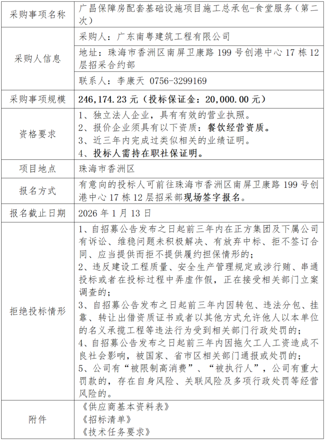 廣昌保障房配套基礎(chǔ)設(shè)施項(xiàng)目施工總承包-食堂服務(wù)(第二次) 專欄:工程招標(biāo) 發(fā)布日期: 2026-01-08 作者:招采管理中心 附件:供應(yīng)商基本資料表 附件:廣昌保障房配套基礎(chǔ)設(shè)施項(xiàng)目施工總承包-食堂服務(wù) - 空白清單 附件:廣昌保障房配套基礎(chǔ)設(shè)施項(xiàng)目施工總承包-食堂服務(wù)招標(biāo)要求 返回列表 上一篇:廣昌保障房配套基礎(chǔ)設(shè)施項(xiàng)目施工總承包--土石方工程專業(yè)分包(第二次) 下一篇:廣昌保障房配套基礎(chǔ)設(shè)施項(xiàng)目施工總承包--交通、安監(jiān)工程專業(yè)分包(第二次)