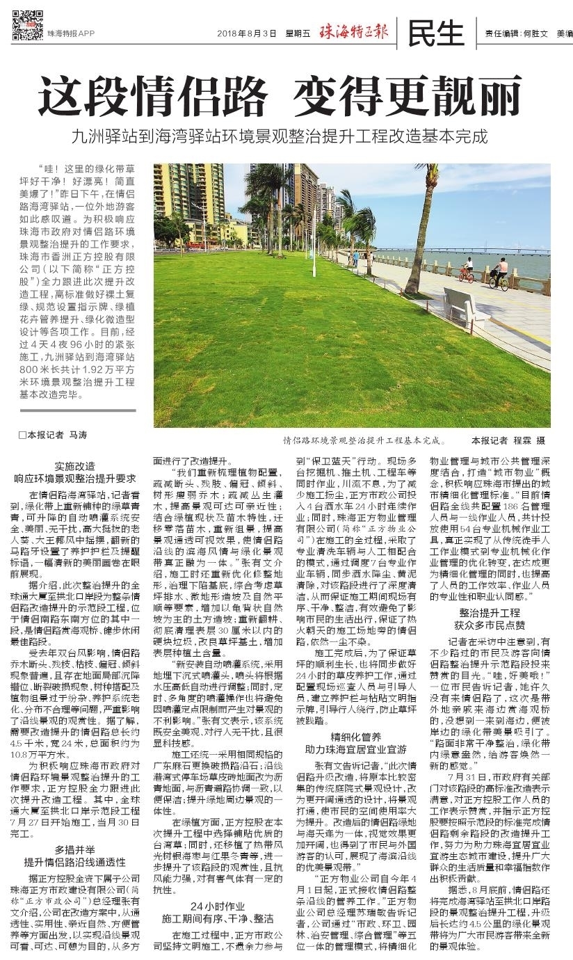 7月31日,市政府有關(guān)部門對該路段的高標(biāo)準(zhǔn)改造表示滿意,對正方控股工作人員的工作表示贊賞,并指示正方控股要按照示范段的標(biāo)準(zhǔn)完成情侶路剩余路段的改造提升工作,努力為助力珠海宜居宜業(yè)宜游生態(tài)城市建設(shè),提升廣大群眾的生活質(zhì)量和幸福指數(shù)作出積極貢獻。