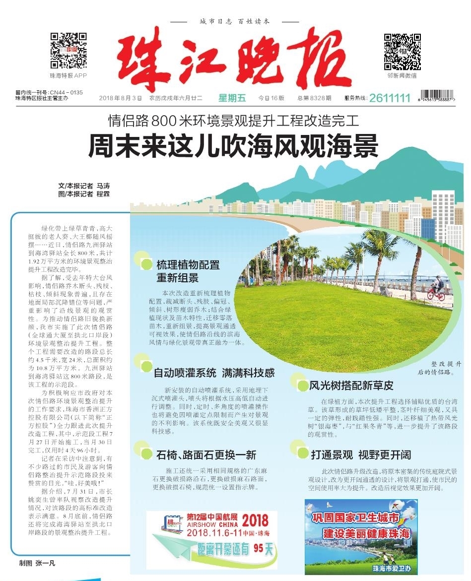 為積極響應(yīng)市政府對(duì)本次情侶路環(huán)境景觀整治提升的工作要求,珠海市香洲正方控股有限公司(以下簡(jiǎn)稱(chēng)“正方控股”)全力跟進(jìn)此次提升改造工程,其中,示范段工程7月27日開(kāi)始施工,當(dāng)月30日完工,僅用時(shí)4天96小時(shí)。