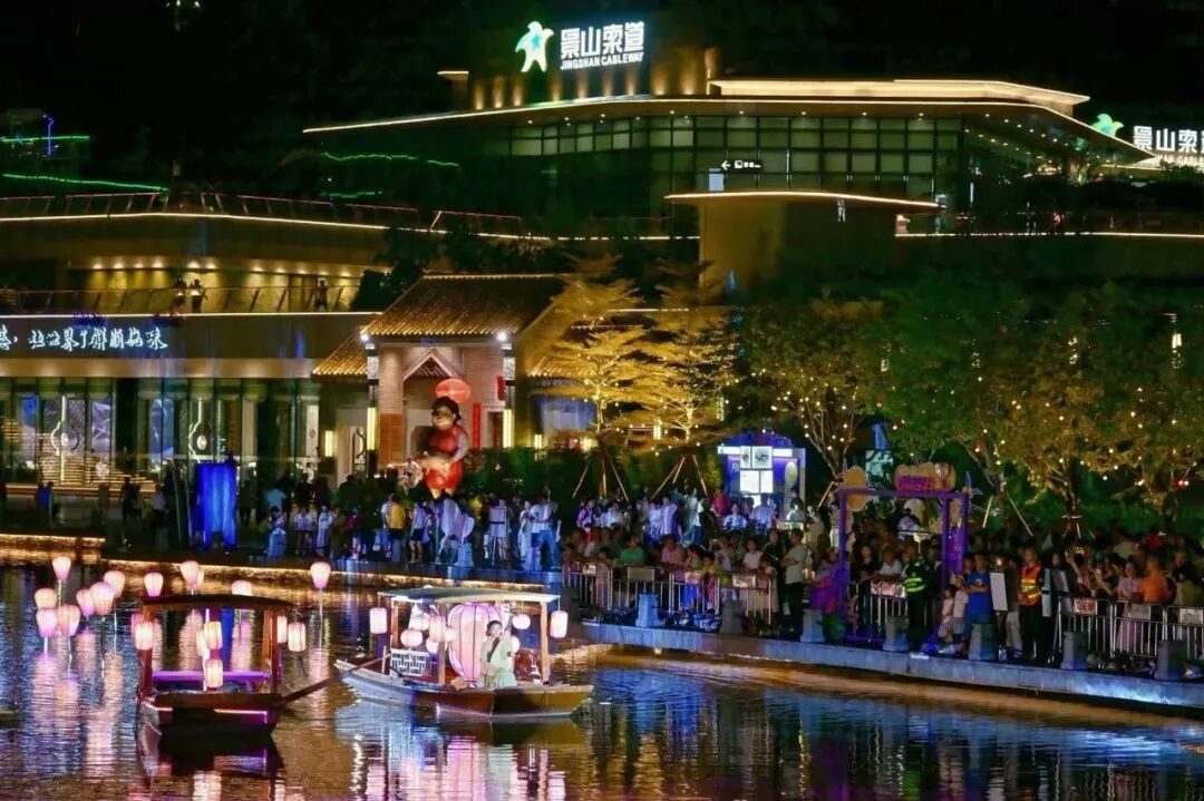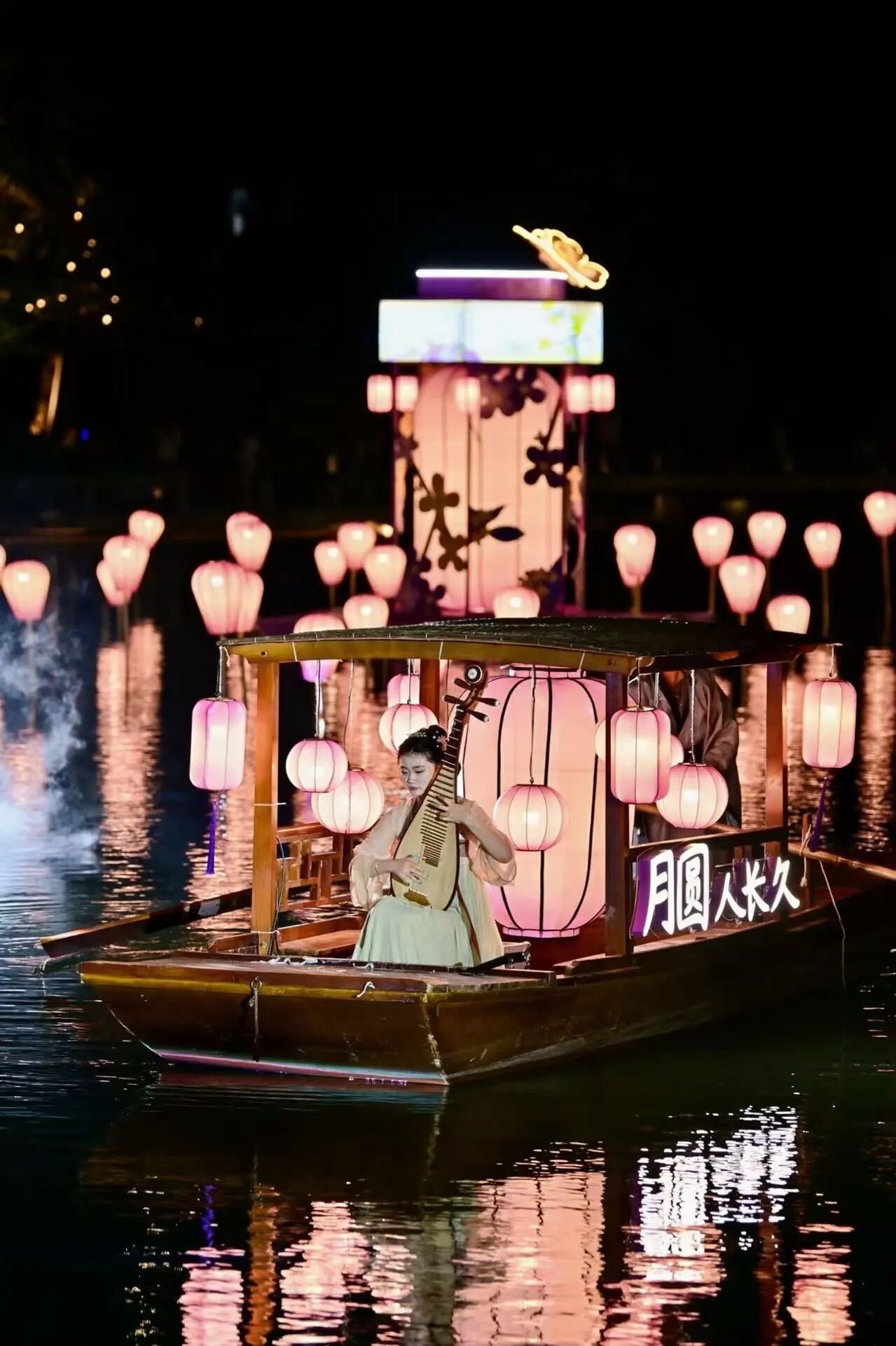 10月2日晚,夜色漸濃,正方優(yōu)和匯·城市陽臺中秋宮廷花燈會的百余盞宮廷花燈,在翠湖岸邊驟然點亮。華燈初上時,暖黃、柔粉等各色燈光透過紗絹燈罩漫開,在湖面映出搖曳的光影。湖心上緩緩駛過一艘小船,琵琶演奏者在船上指尖輕撥,樂聲伴燈影浮動。這片兼具古樹、疊石、湖心亭的嶺南特色水岸,瞬間化作古意盎然的“光影秘境”,引得市民游客紛紛駐足、打卡記錄。